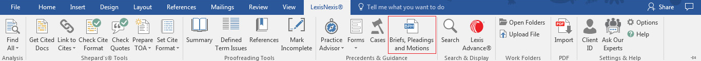 Begin legal drafting with relevant, valuable precedent documents at your fingertips. Lexis® for Microsoft® Office drafting tools connect you directly with Lexis® legal content and Practical Guidance® practical guidance from attorney authors. Save time by accessing everything you need from within your Microsoft® Word document.