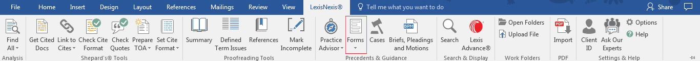 In Microsoft® Word and during transactional matters, use Samples & Forms to minimize duplication of effort by leveraging sample forms relevant to your work from the Matthew Bender® model forms collection. The Lexis® delivery methods of Download, Print or Email are available to save a fillable form.