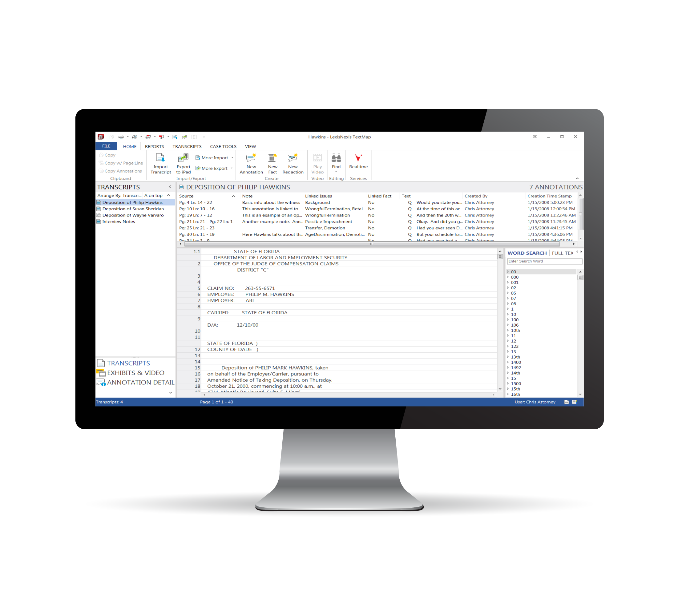 TextMap transcript management software helps you easily manage your transcripts in an electronic format. Each electronic transcript you import — case deposition, examination or other proceeding — to TextMap is created as a database so you can efficiently search, annotate, add notes, create summary reports or cull key transcript passages.